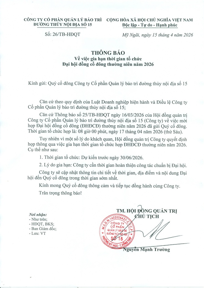 THÔNG BÁO V/V GIA HẠN THỜI GIAN TỔ CHỨC ĐẠI HỘI ĐỒNG CỔ ĐÔNG THƯỜNG NIÊN NĂM 2026